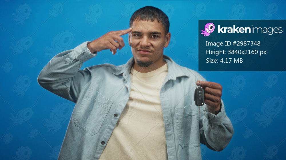 Man touching temple with finger while holding car keys in studio vibrant blue backdrop; playful confidence.
