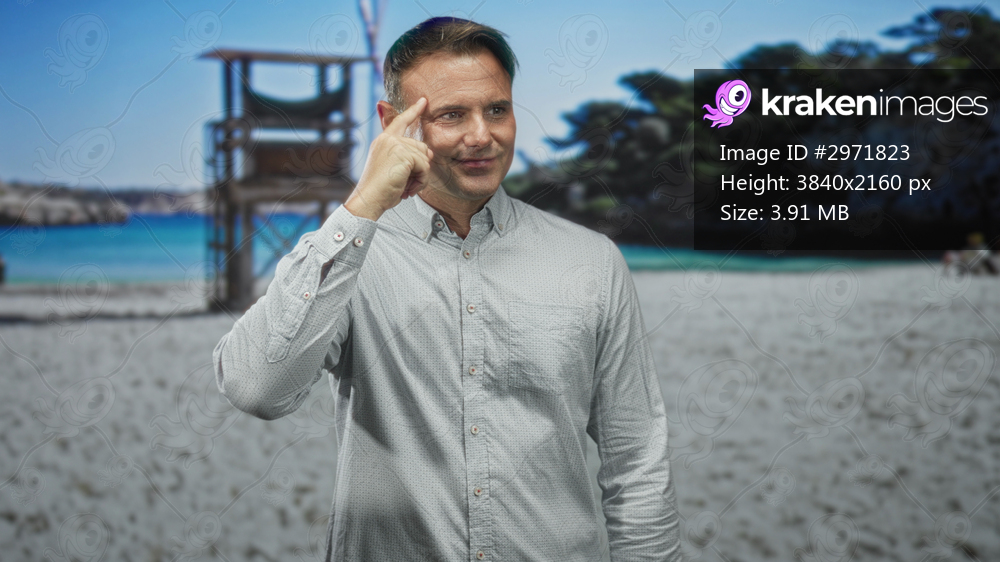 Man touching temple with index finger, winking and smiling, in studio with beach backdrop and lifeguard tower visible; idea thoughtful.