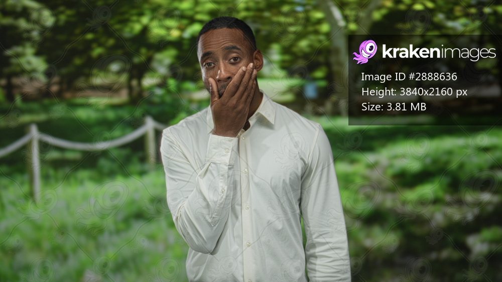 Man touching temples, raising open hands and covering mouth in forest wearing a white shirt and ring; thoughtful.