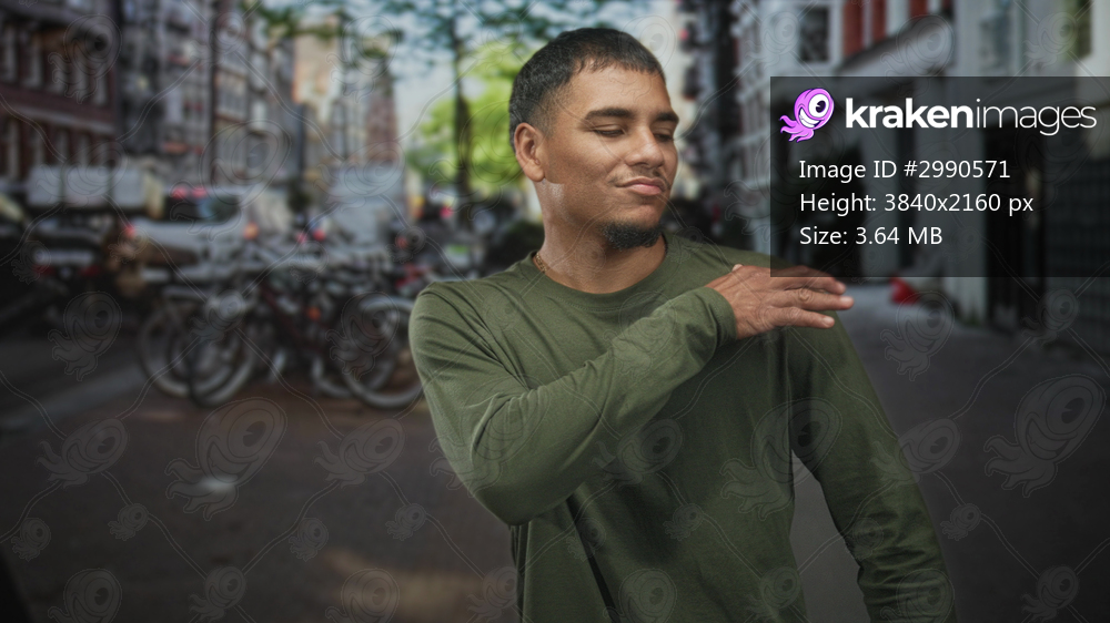 Man tugs green long sleeve shirt with hands, hand to shoulder, standing on a street lined with parked bicycles and brick buildings; confidence authenticity. - Kraken Images