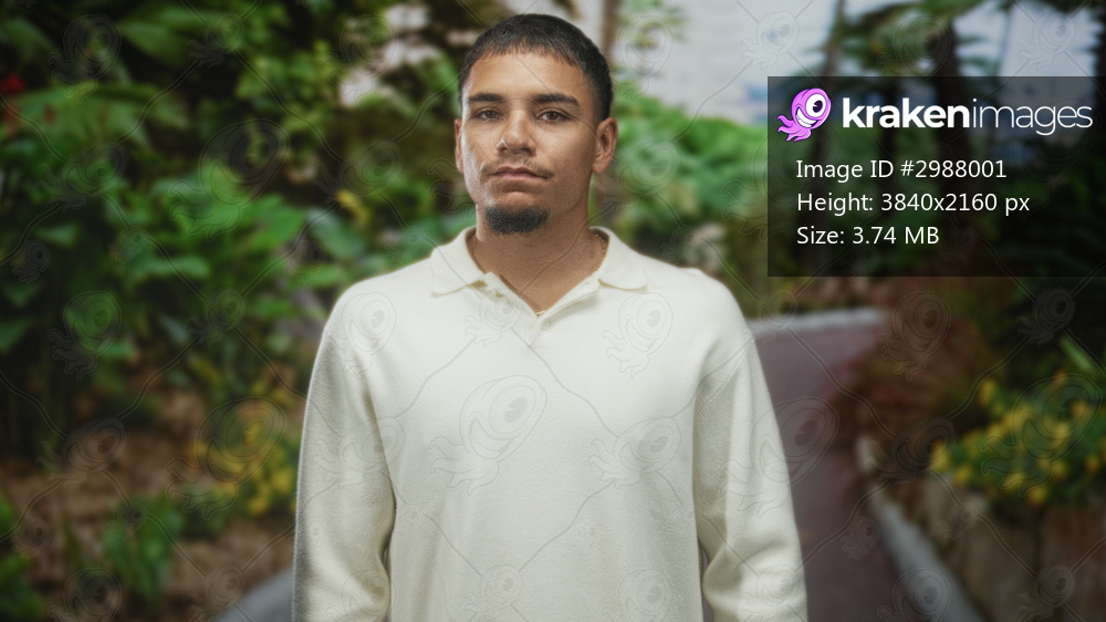 Man turns head to right on a shaded street path lined with palms and dense foliage, wearing cream polo and gold chain; calm reflection.