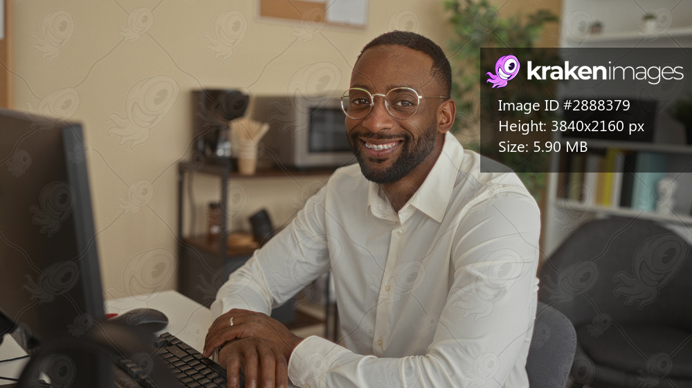 Man typing on keyboard with hands on keys, wearing round glasses and white shirt at a desk in an office building; focus productivity confidence.