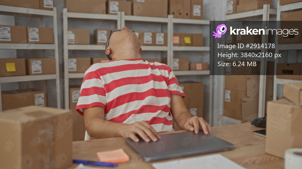Man typing on laptop among stacked cardboard parcels and metal shelving in building, hands on keyboard and leaning back with weary expression; small business fatigue. - Kraken Images