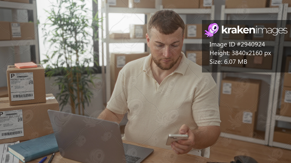Man typing on laptop beside stacked parcels and smartphone on desk in storage building; concentration entrepreneurship.
