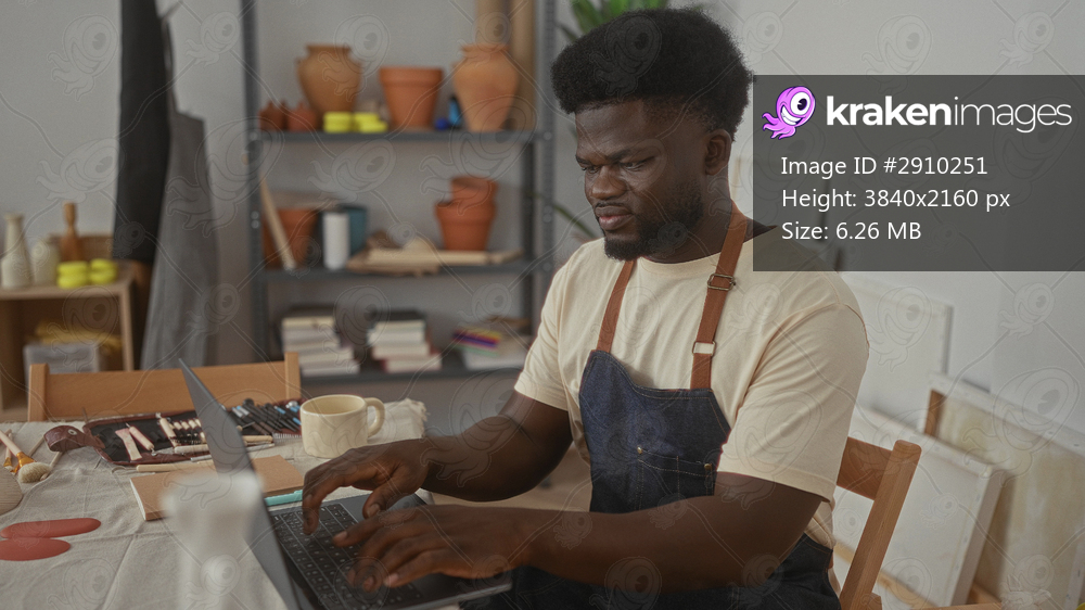 Man typing on laptop with hand on keyboard and holding a ceramic mug at a pottery studio table surrounded by tools and clay pots; creativity focus calm. - Kraken Images