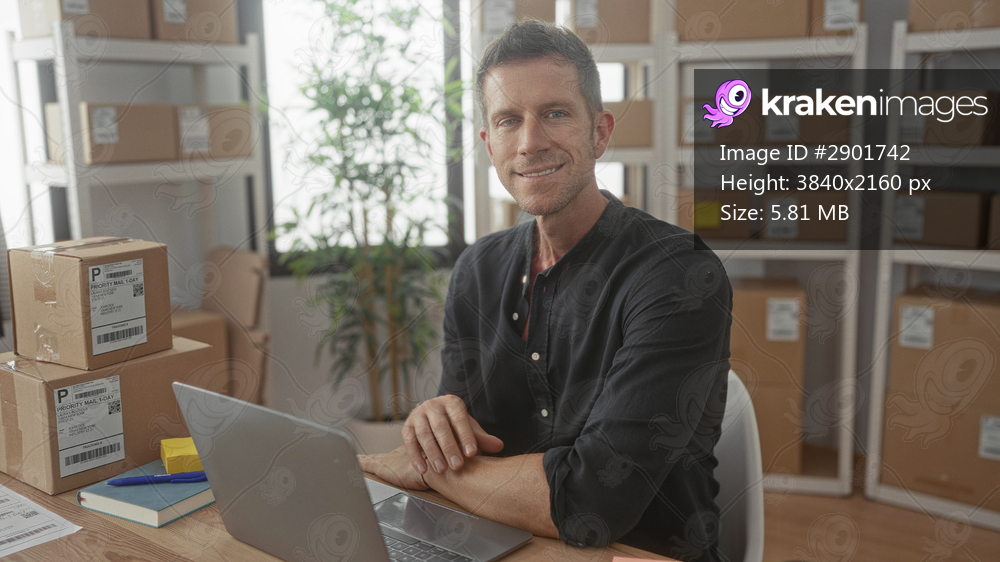 Man typing on laptop with parcel boxes stacked and shipping labels visible beside notebook and sticky notes at desk in building; focused small business planning. - Kraken Images