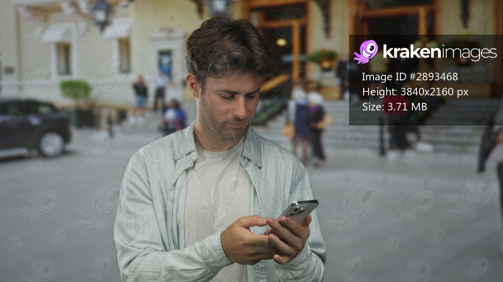 Man typing on smartphone with hands on screen on street in front of building steps, checking messages; urban connection focus.