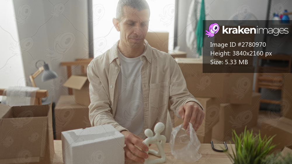 Man unpacking in a new home, surrounded by boxes in a bright living room, carefully arranging items in a modern apartment setting conveying moving day excitement. - Kraken Images