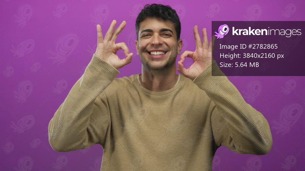 Man uses hand gesture against background to present male hispanic young ok approval purple mood.