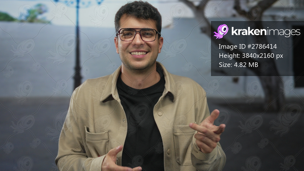 Man uses hand when pointing across street to highlight hispanic young glasses smile guy gesture conveying confidence.