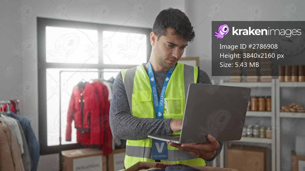 Man uses laptop while typing at center alongside young hispanic volunteer handling donations with male assistant supporting charity.