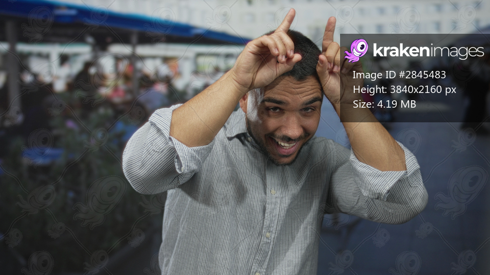 Man uses rock horns gesture with fingers on head while smiling among tables in a building restaurant terrace; rock fun metal.