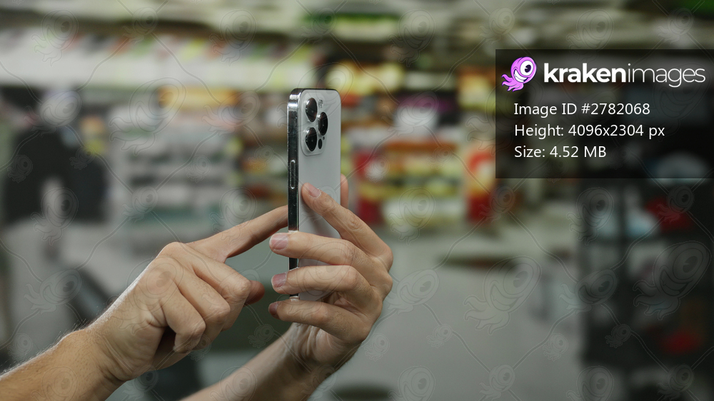 Man using smartphone in a mall store setting while hand gesture interacts with device amid blurred shopping environment, capturing modern consumer lifestyle. - Kraken Images