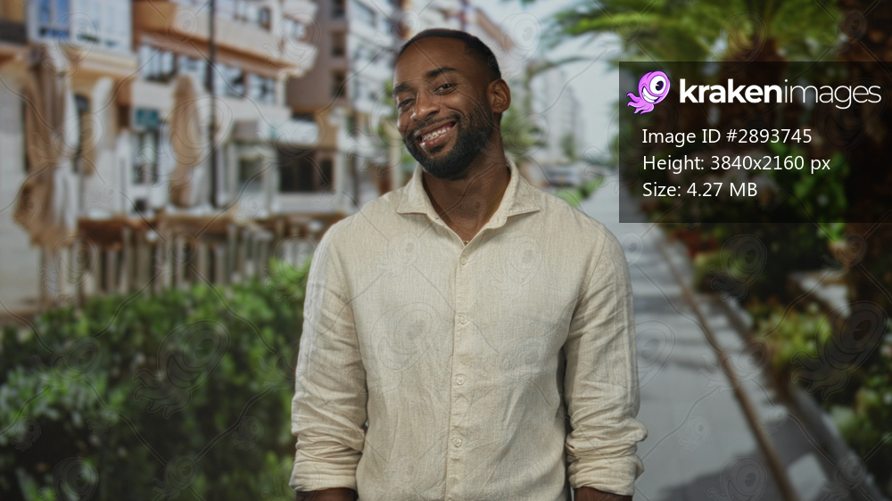 Man with visible face smiling with eyes closed on a sunlit street lined with palm trees and outdoor cafes, wearing a light linen shirt; serenity summer. - Kraken Images