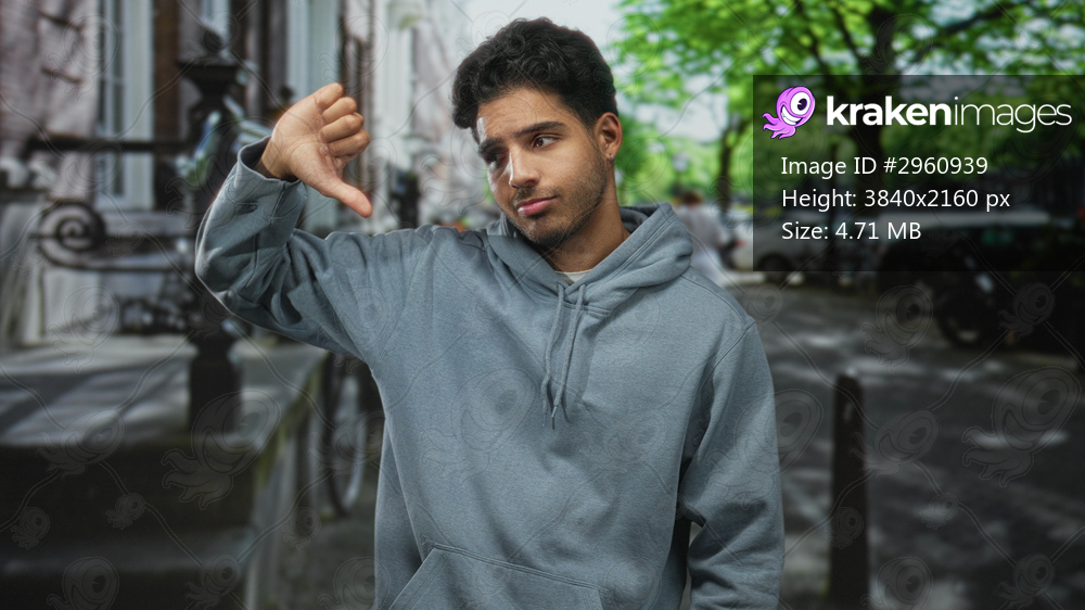 Man with visible thumb gesture and gray hoodie standing on a city street; ambivalence decision reflection.