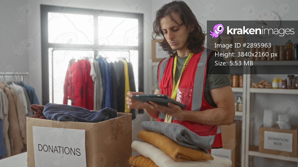 Man volunteer in safety vest taps tablet by donation box inside building; compassion community service.