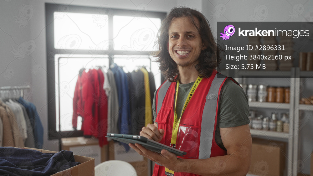 Man volunteer tapping tablet with finger and visible forearm in building volunteer center room, wearing red vest and lanyard; community support compassion. - Kraken Images