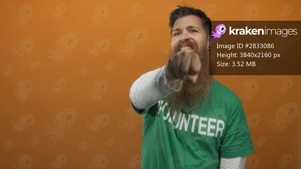 Man volunteer wearing green shirt extends fist in studio with orange backdrop; community support enthusiasm.