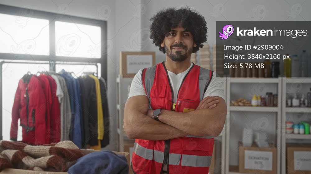 Man volunteer wearing red safety vest with arms crossed and smiling inside a donation center building surrounded by boxes and clothing racks; community service compassion. - Kraken Images