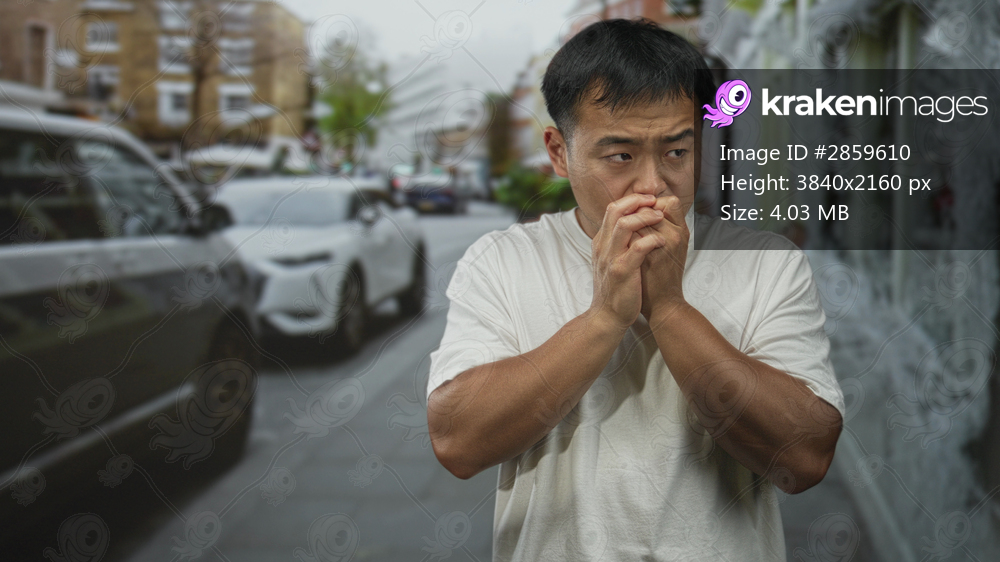 Man warms cold hands by clasping them at mouth next to parked cars on a busy urban street during winter morning; cold.