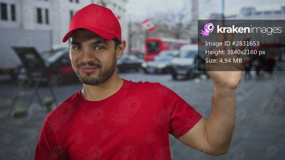Man wave hand beside delivery van on busy urban street in city center during daytime; friendly greeting.