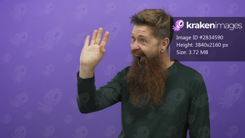 Man waves hand with bushy beard and open mouth in vibrant purple studio setting, looking right; enthusiasm.