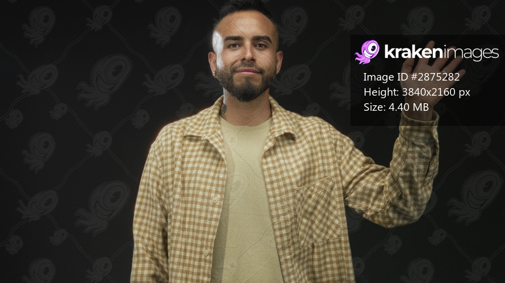 Man waves hand in black studio wearing beige checkered shirt and tan tee, beard and raised palm visible; friendly greeting.