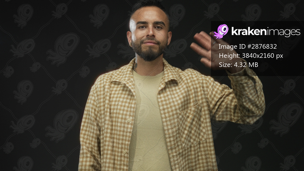 Man waves hand in black studio wearing beige checkered shirt and tan tee, beard and raised palm visible; friendly greeting.