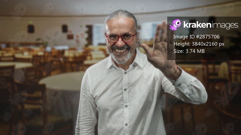 Man waves hand inside restaurant building, smiling and showing open palm while wearing white shirt and red glasses; friendliness welcome.