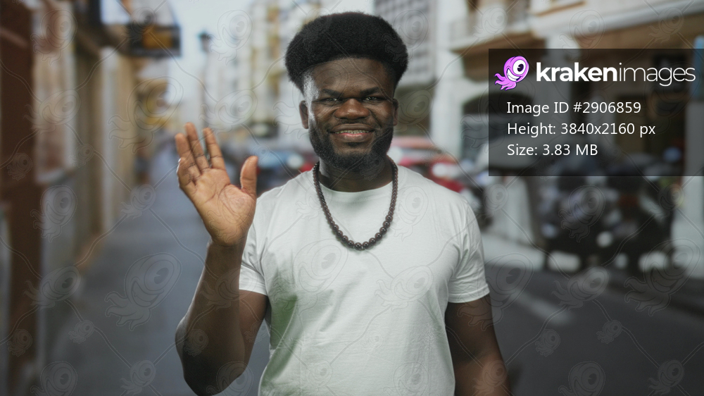 Man waves hand on city street wearing white t shirt and beaded necklace while smiling; friendly greeting.