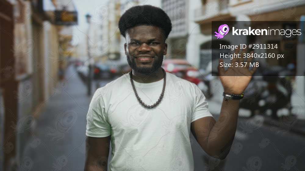 Man waves hand on city street wearing white t shirt and beaded necklace while smiling; friendly greeting.