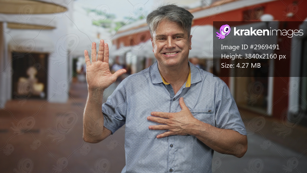 Man waves hand and places other hand on chest on a busy pedestrian street with storefront awnings; greeting gratitude warmth.