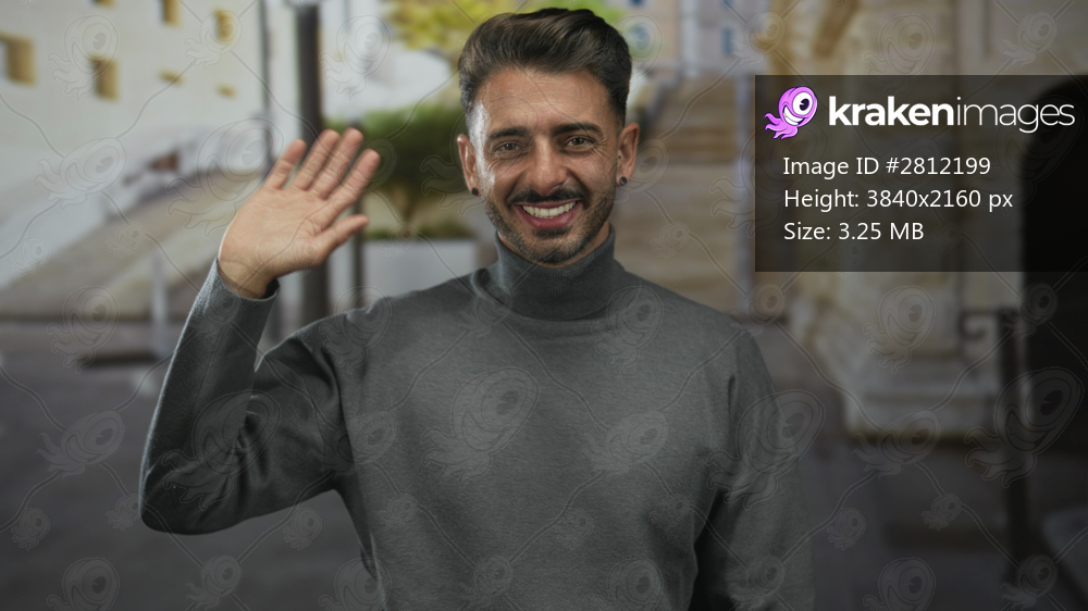 Man waves hand with smiling face on old town street lined with historic stone buildings at midday; friendly greeting.