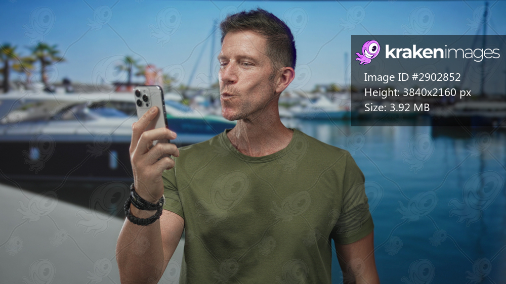 Man waves hand while holding smartphone on street beside marina and moored boats, smiling into screen in a video call; happiness connection.