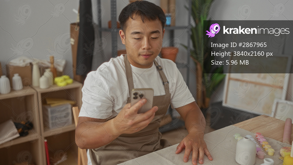 Man waves with one hand while holding smartphone with other hand and displaying clay pot wearing apron in studio room; happiness creativity inspiration. - Kraken Images