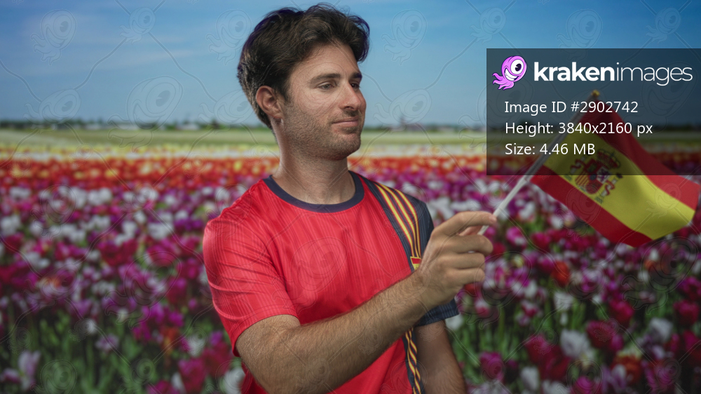 Man waving a small spanish flag with one hand in a colorful tulip field while wearing a red soccer jersey and looking sideways; national pride.