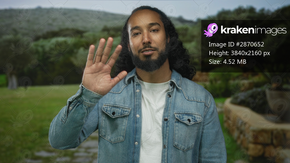 Man waving hand in forest clearing while smiling at camera, wearing denim jacket and white t shirt, long curly hair and beard; friendly greeting.