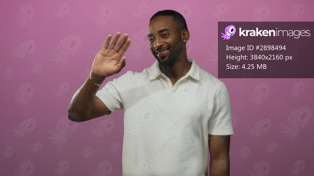 Man waving hand in pink studio with white polo shirt visible and bracelet on wrist; cheerful greeting.