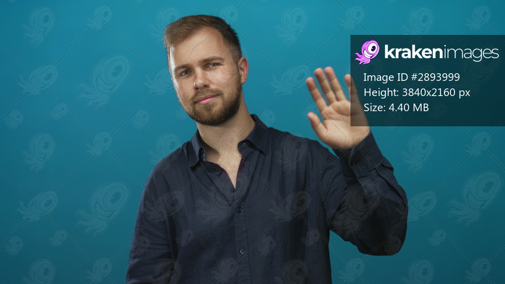Man waving hand in teal studio, wearing navy shirt and beard visible, open collar and relaxed posture facing camera; friendly greeting.