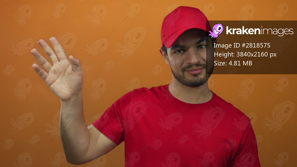 Man waving hand and smiling in orange studio wearing red cap and shirt under soft lighting; friendly greeting.