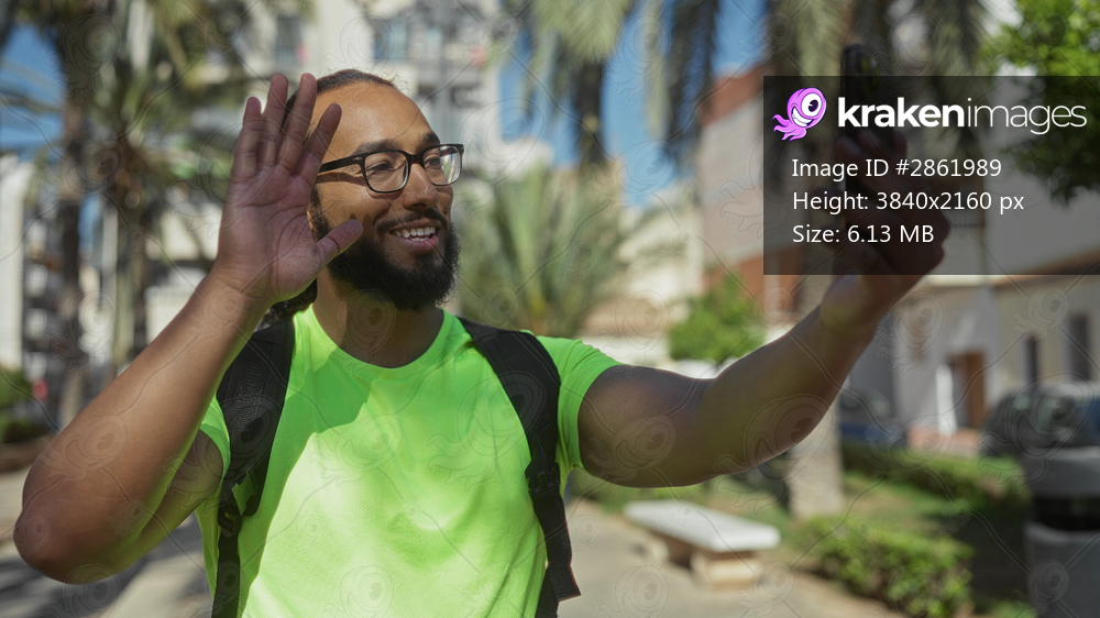 Man waving hand while holding smartphone and wearing backpack on a sunny city street lined with palm trees; friendly connection joy.