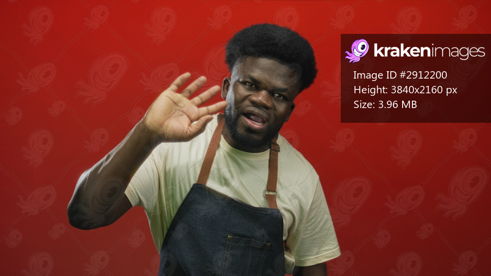 Man waving hands in studio against bright red wall wearing denim apron and white t shirt, mouth open and palms forward; surprise greeting.