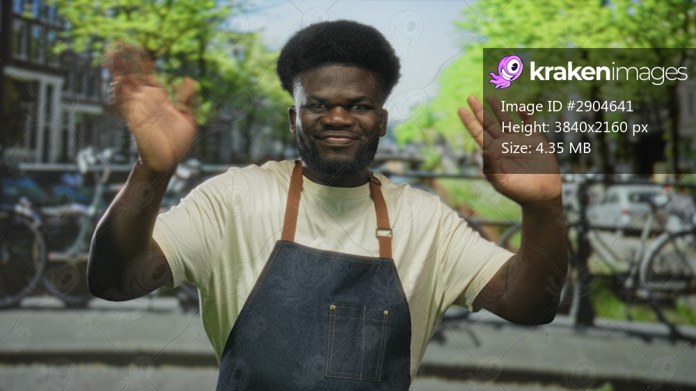 Man waving raised hands on an amsterdam canal street by bicycles and water near a bridge railing; friendly greeting.