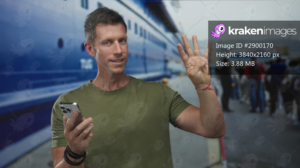 Man waving right hand at port near a blue ferry holding smartphone and wearing olive green t shirt while passengers queue behind him; friendly farewell. - Kraken Images