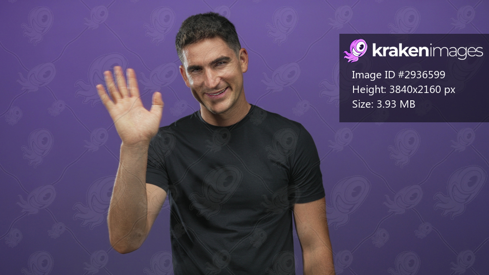 Man waving right hand in purple studio while smiling and facing camera, casual black t shirt; welcoming greeting.