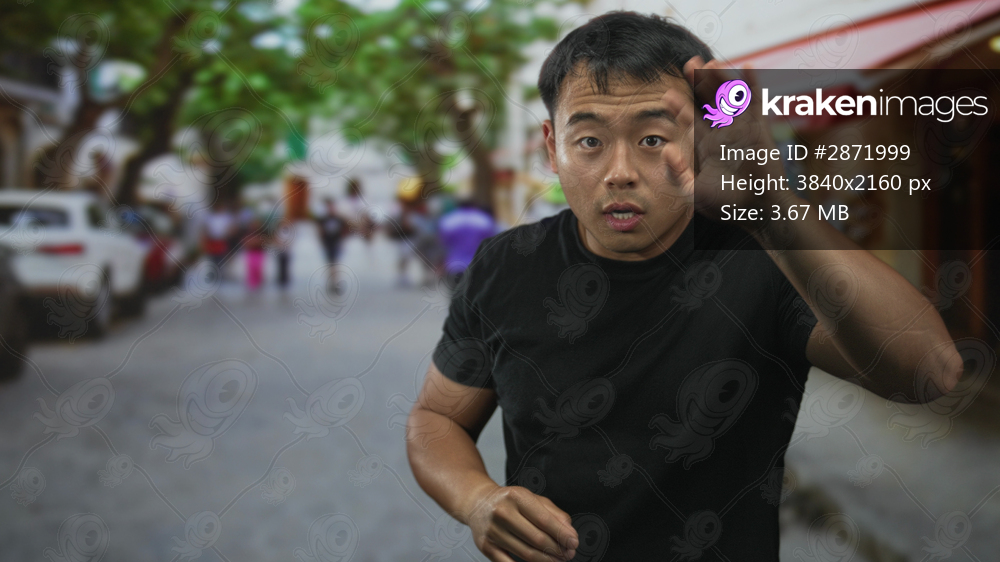 Man wearing a black t shirt with cupped hands shouting on a bustling street lined with storefronts; urgent call.