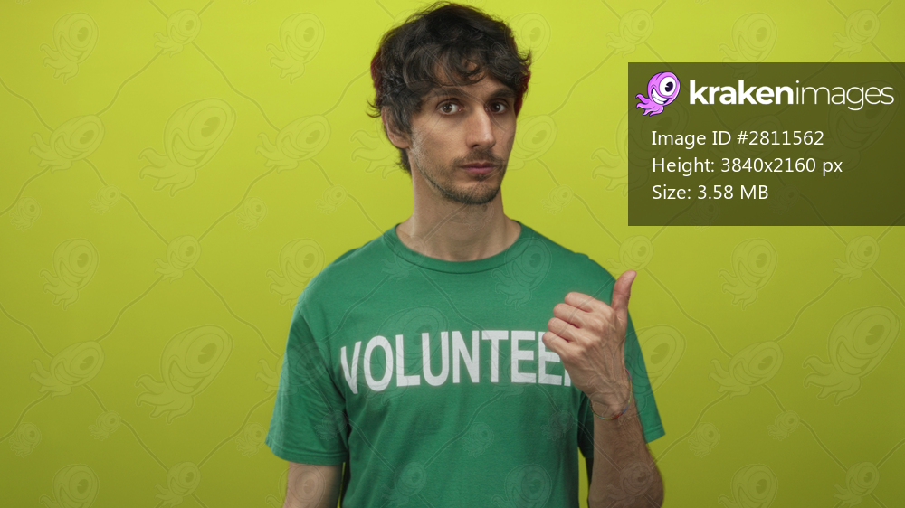 Man wearing a branded green volunteer t shirt and raised thumb points to side in studio setting; support.