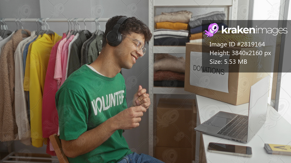 Man wearing a green volunteer shirt performs a fist pump beside a donation box in a building; enthusiasm.