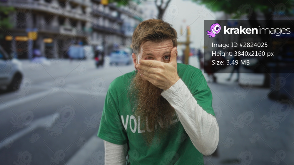 Man wearing a green volunteer t-shirt covers eyes with hand on busy city street lined with buildings; embarrassment.