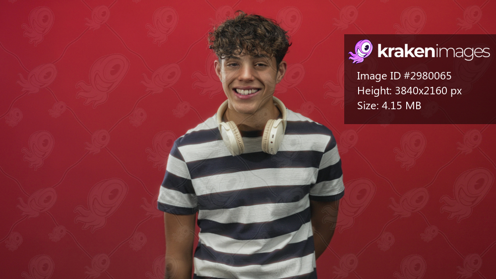 Man wearing a navy and white striped shirt with white headphones around his neck, smiling with eyes closed and hands behind back in a red studio backdrop; youthful relaxed joy. - Kraken Images